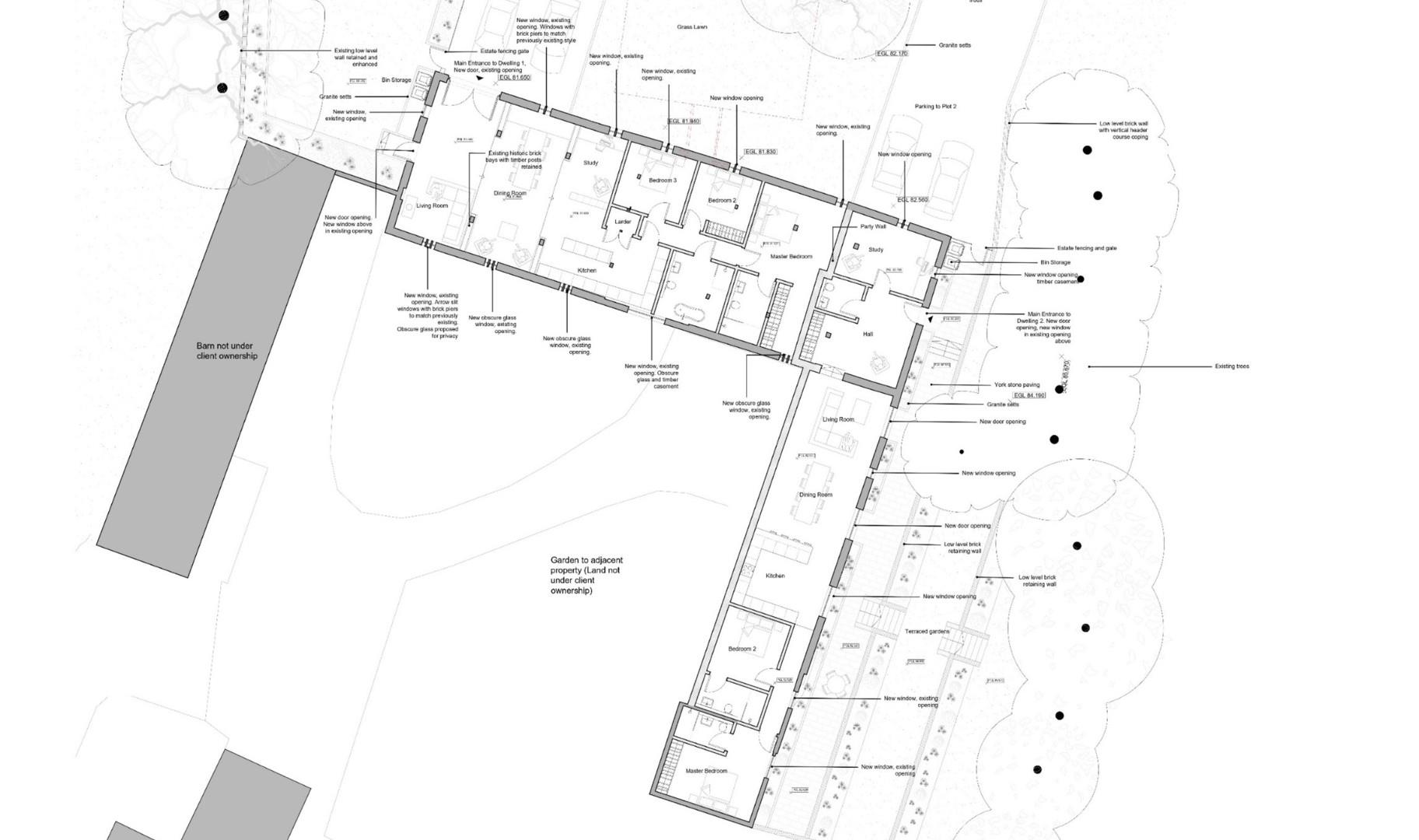Planning permission has been granted for the conversion of a Grade II Listed Barn into two residential dwellings with associated parking and landscaping. This Grade II listed barn dates back to 1739 although there is evidence to suggest that some timbers pre-date this. The site was historically used for the housing of pigs with evidence of blockwork pig styes internally.The existing listed barn will be fully restored and converted into one single storey, 3 bedroom dwelling. The cowshed will be reinstated and converted into a 2 bedroom dwelling. The 20th century barn to the north of the listed barn is to be demolished, with part of the land occupied by the barn to be made into external amenity space and parking for the two dwellings.