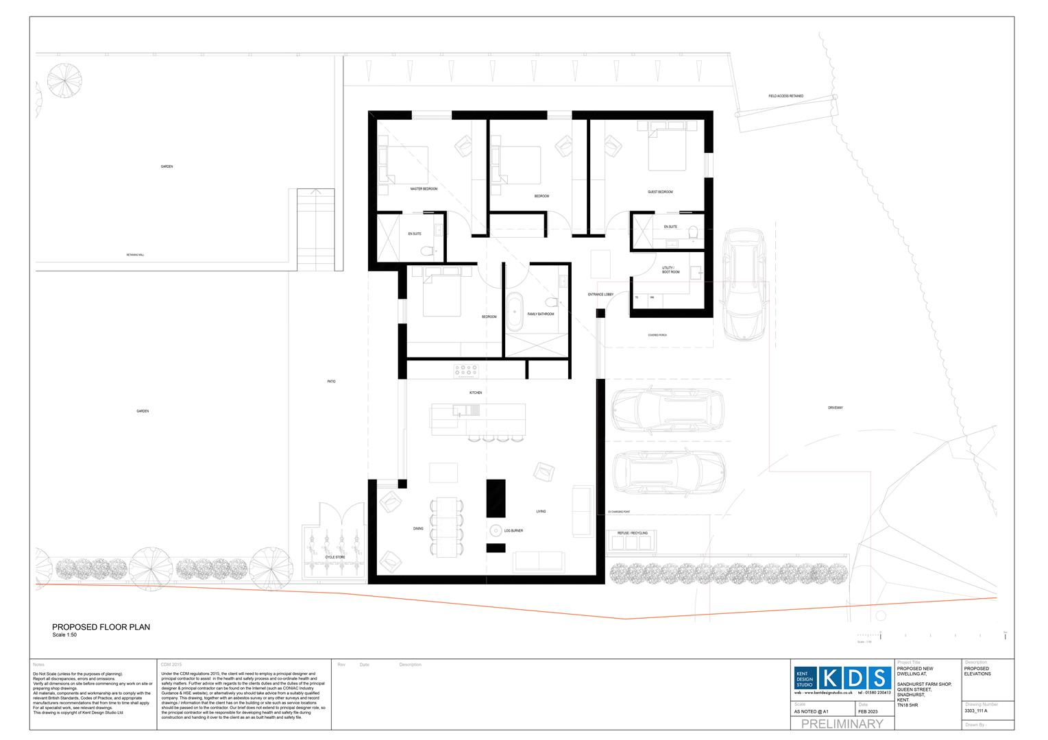 Outside is a proposed driveway coming in from Queens Street to the north east and leading up to the proposed dwelling where there has been three off road Parking Spaces. There will be landscaped gardens and grounds to the south east. Please see the consented elevations and floor plans along with a proposed Block Plan overleaf for further information.